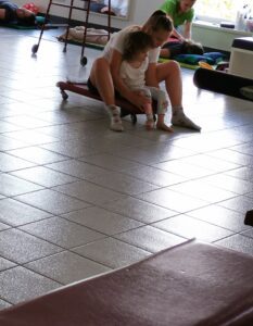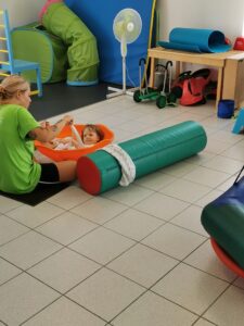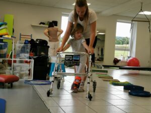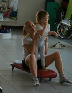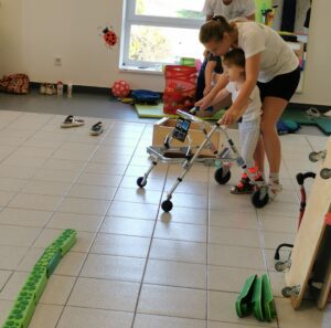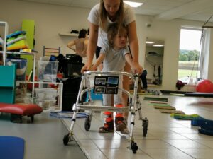 Nagyon szépen teljesítette a feladatokat, különösen az állást, mozgó gördeszkán, és a lépegetést a járássegítővel.