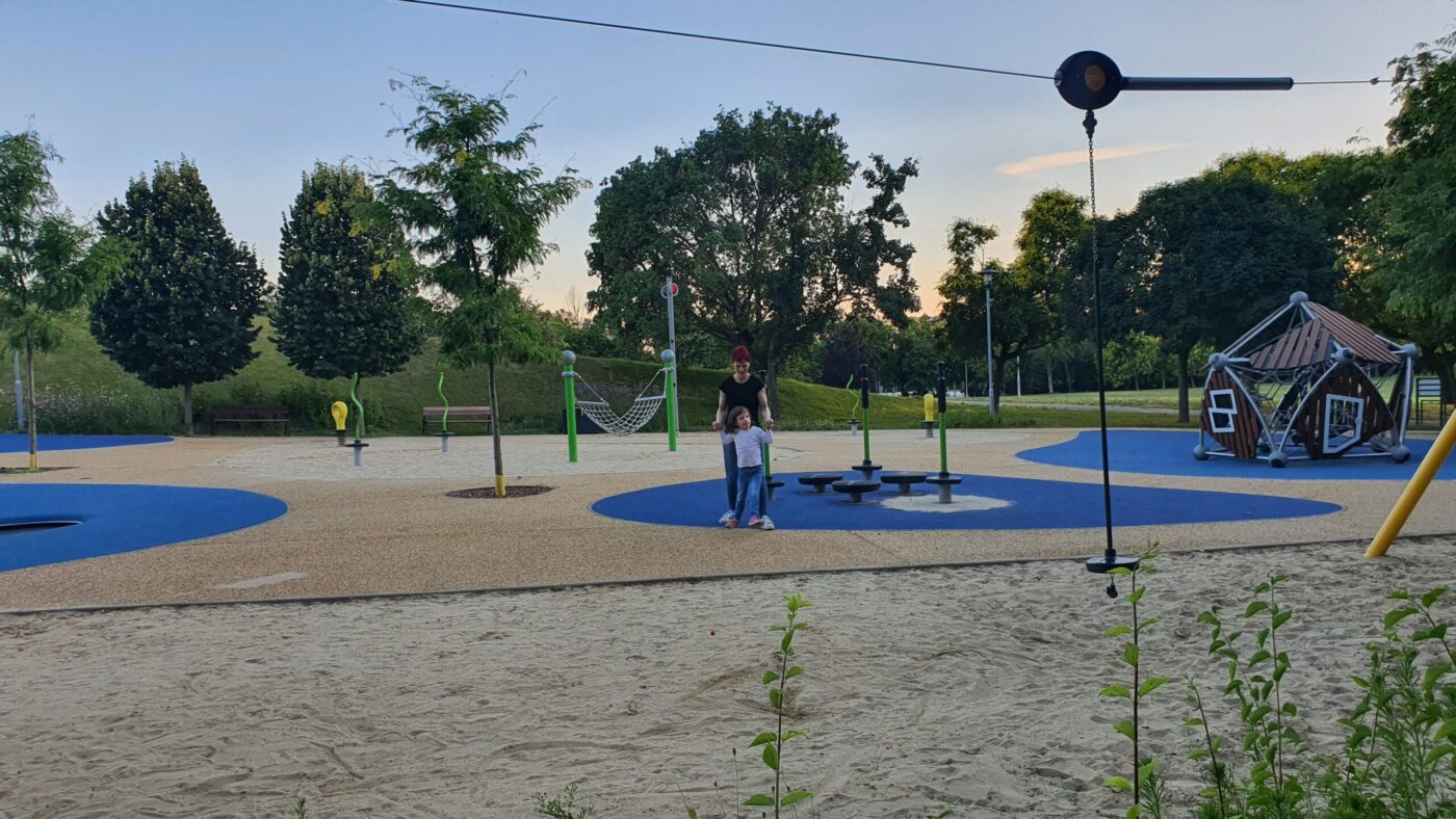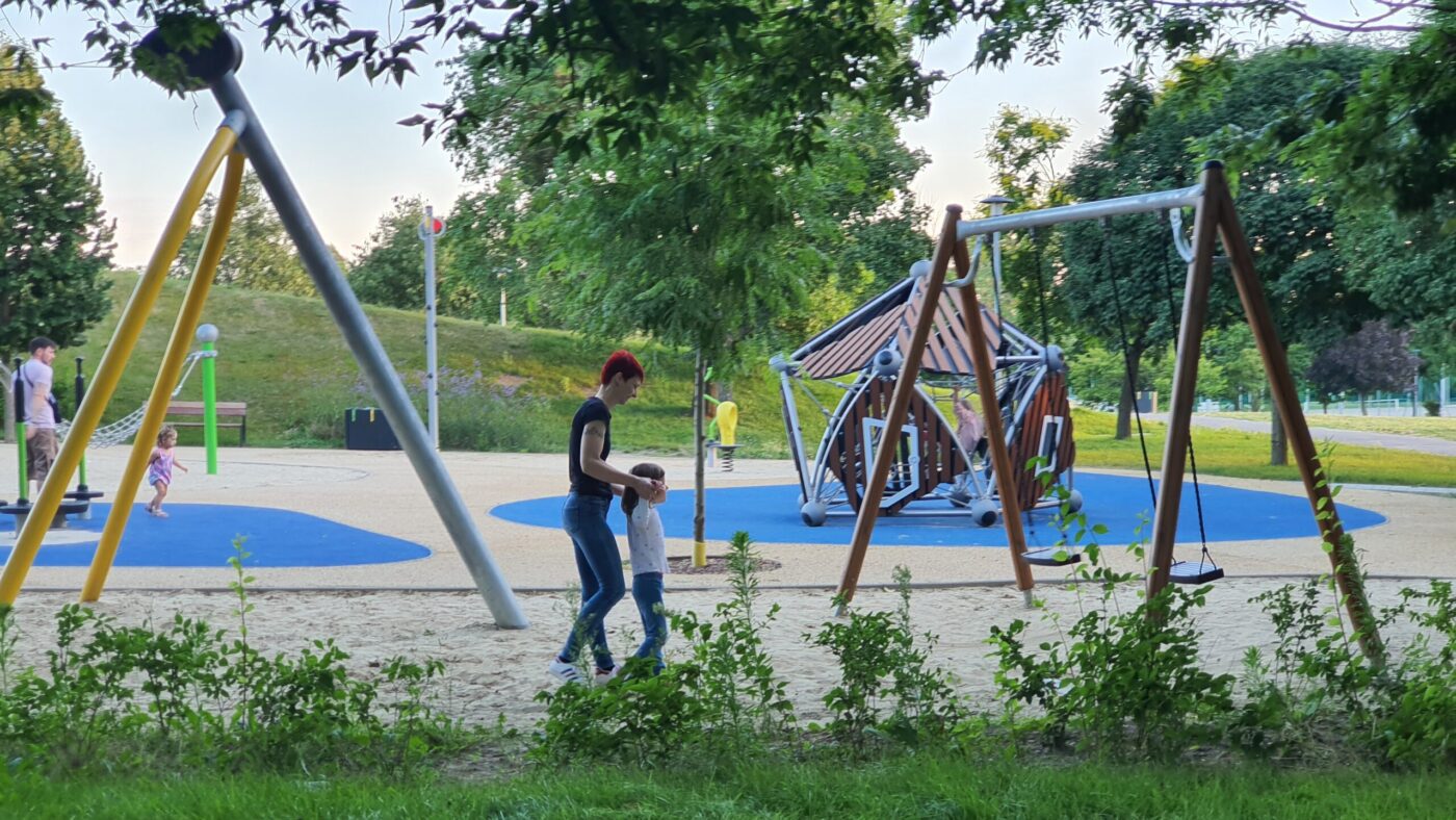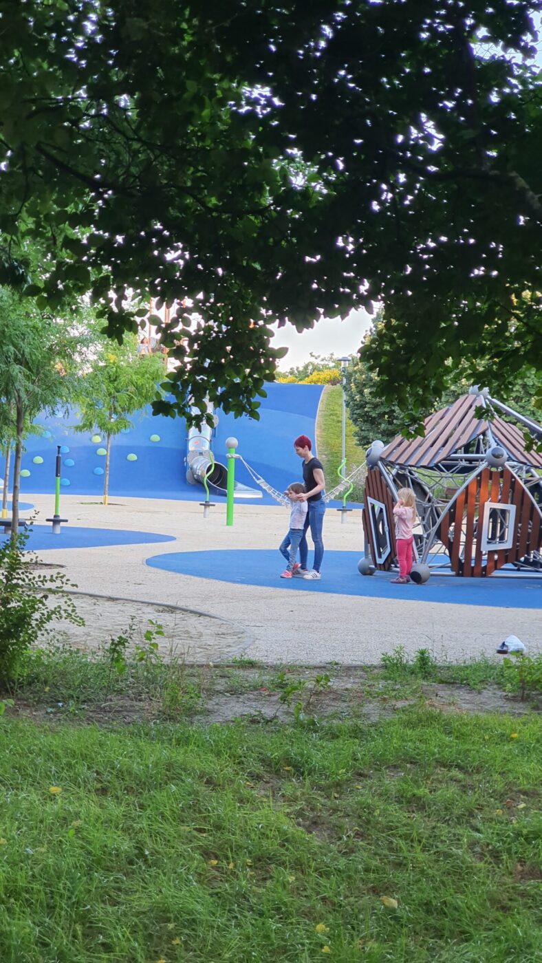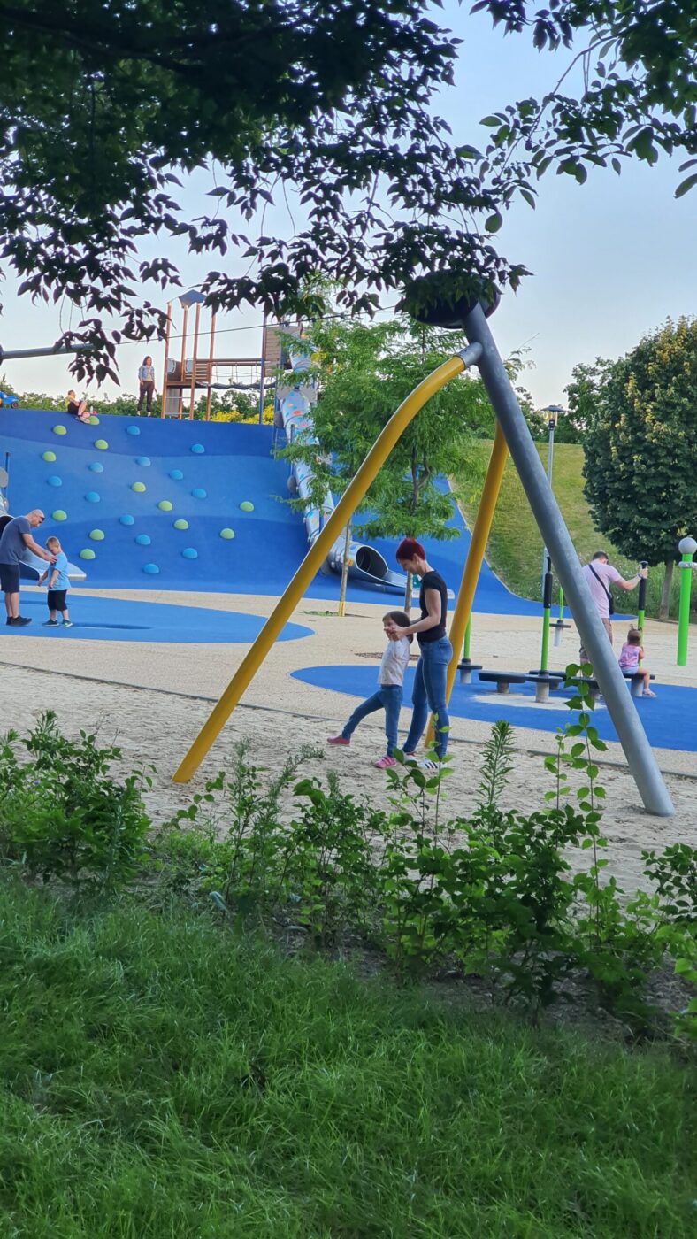 Se szó, se beszéd, kiszállítja magát a babakocsiból, és több mint fél ora játék/séta után, mint a „rendes” gyerekek, úgy kellett kérlelni, hogy induljunk haza, mert későre jár!
