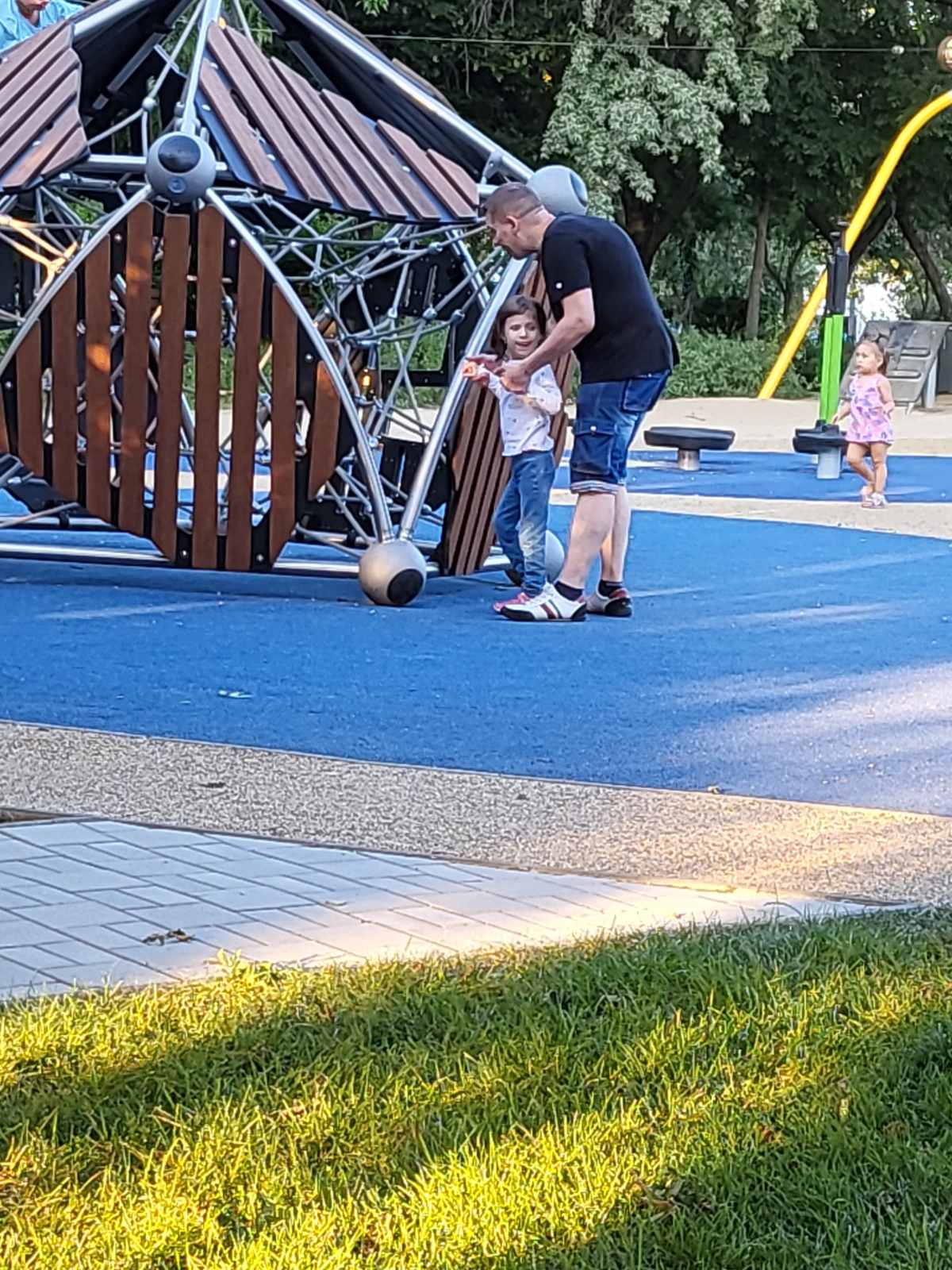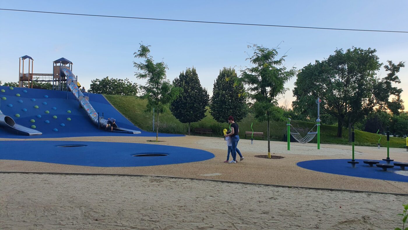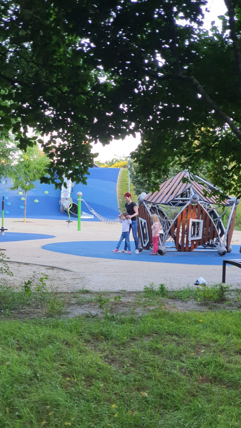 Se szó, se beszéd, kiszállítja magát a babakocsiból, és több mint fél ora játék/séta után, mint a „rendes” gyerekek, úgy kellett kérlelni, hogy induljunk haza, mert későre jár!